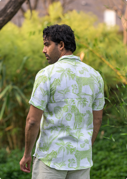 A relaxed yet structured shirt featuring our signature tropical print, an ode to dense foliage, warm afternoons, and the interplay of shadow and sunlight. Crafted for comfort, cut for versatility, this piece can be buttoned up for a refined look or worn open over a tee for laid-back ease.