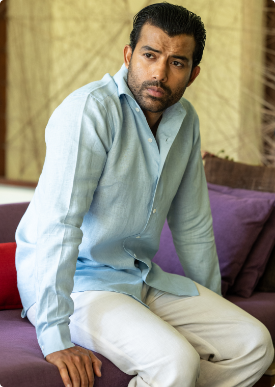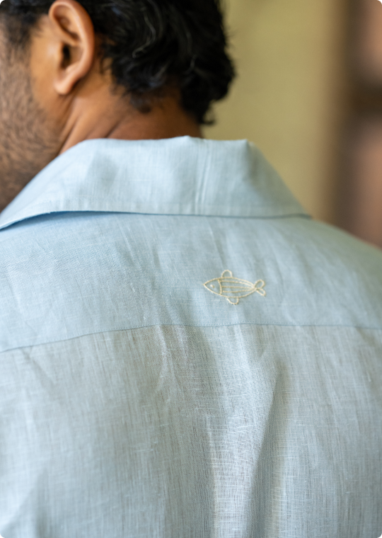 A classic linen shirt, elevated by a hidden detail, an embroidered fish at the back of the collar, like a quiet secret. Made to soften with wear, these shirts move from day to night, from home to celebration, with a natural ease. Wear them buttoned up for structure or open over a tee for relaxed layering.